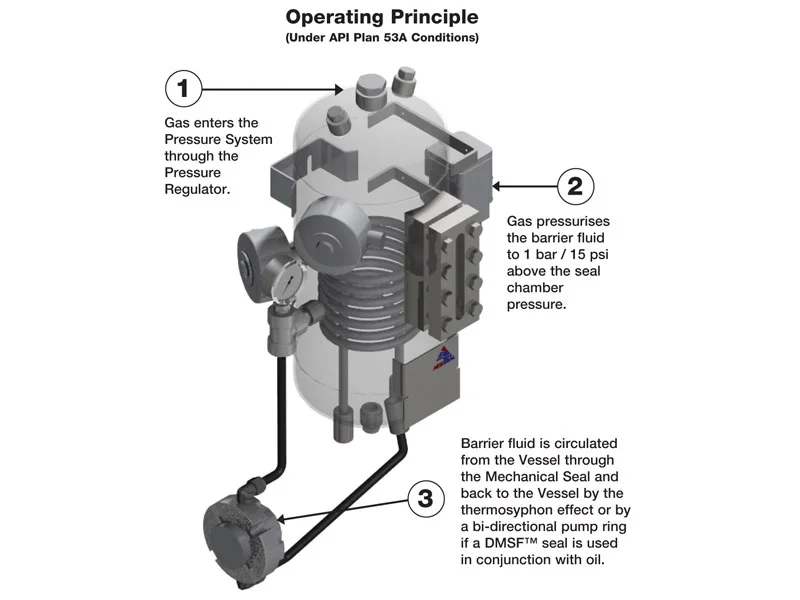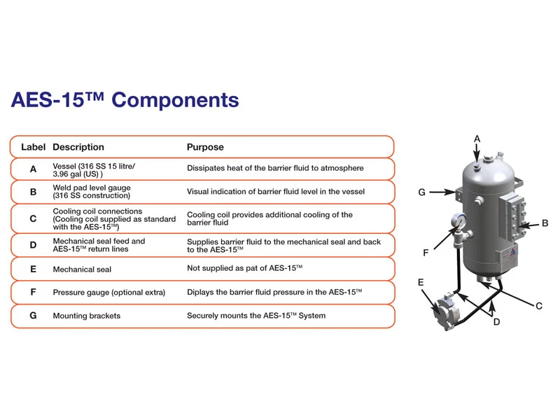 The AES-15 vessel forms the core of a robust, low maintenance and highly reliable Seal Support System. The vessel is constructed from 316 stainless steel and is designed to meet the high-end needs of the chemical, pharmaceutical and petrochemical industries. A cooling coil is supplied as standard with the vessel. The AES-15 can operate at pressures up to 30 bar/435psi and temperatures up to 100°C/212°F. Both oil and water can be used as barrier fluids with the AES-15, ensuring its compatibility with a wide range of industrial pump applications.