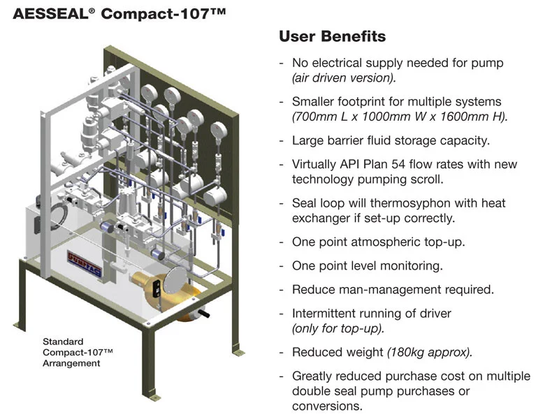 The AESSEAL® Compact-107™ operates by generating a localized pressurized barrier fluid circuit. This unique PUMPPAC™ System combines the benefits of API Piping Plans 53A/53B/54 and feeds barrier fluid to a number of seal support systems which control the environment at the mechanical seal. Localized seal control is enhanced through the ability to supply each seal support system with different pressures due to individual pressure regulators.