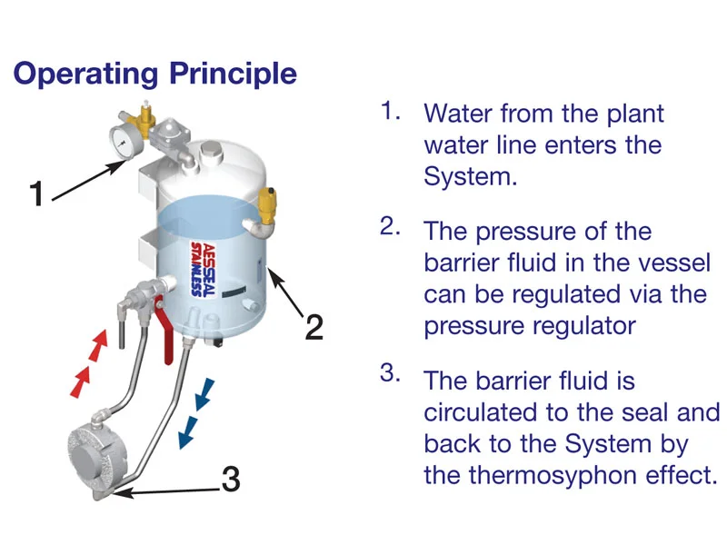 The plant water line pressure can be adjusted so that the Systems barrier fluid pressure is maintained at 1 bar/15psi above stuffing box pressure. This pressure differential keeps harmful products away from seal faces and increases reliability.