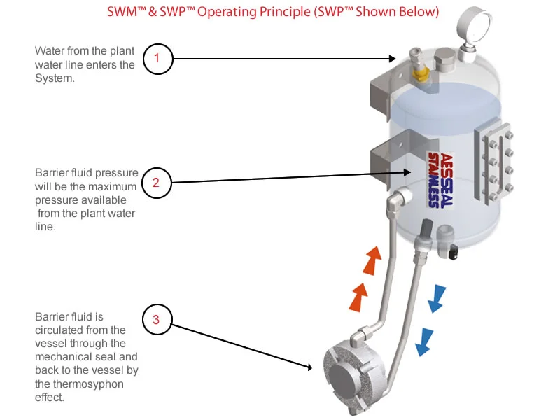 The AESSEAL® SWM™ (System Water Management) and SWP™ (System Weld Pad) vessels are lower cost alternatives to the SW Range of Water Management Systems. Both the SWM™ and SWP™ utilize the pressure available from the plant water line to pressurise the barrier fluid inside the vessel.
